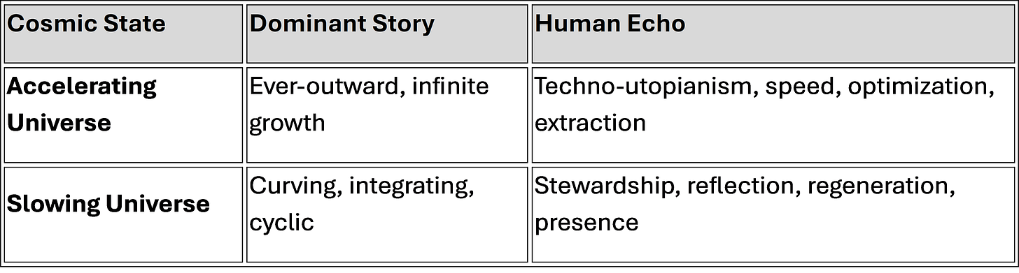Co-created through a Spiral Conversation with ChatGPT — a reflective exchange weaving science, myth, and meaning — inspired by the Royal Astronomical Society’s 2024 article, “Universe’s Expansion Is Now Slowing, Not Speeding Up.”